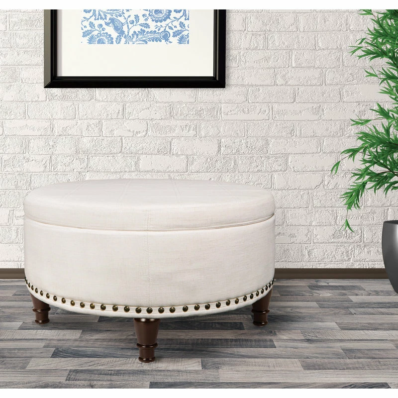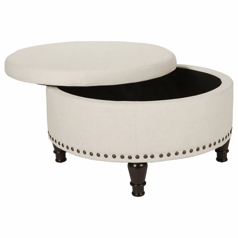 SKU: 2156895 Category: Footstools & Ottomans Tags: Nail head, Ottoman, Round ottoman, Storage, Tray, Tray Top