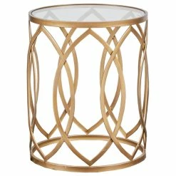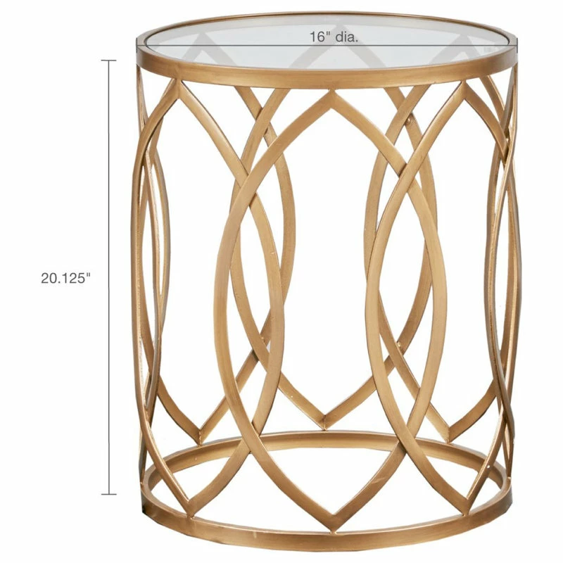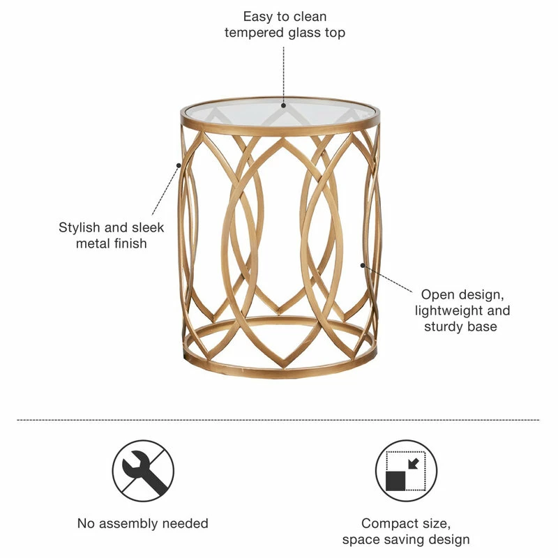 Update your home decor with the modern flair of the Madison Park Arlo Metal Eyelet Accent Table. This round metal accent table flaunts a geometric design with a metal finish to create a stunning contemporary look. A clear, tempered glass tabletop completes this metal accent table. Eye-catching with a unique design, this metal eyelet accent table adds a gorgeous modern touch to your living space. Comes fully assembled.