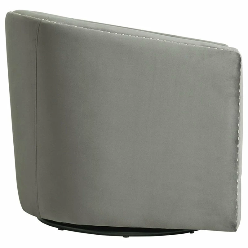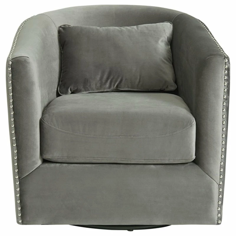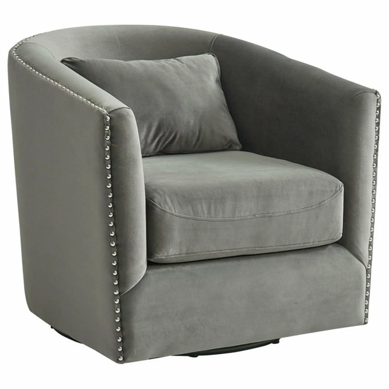 The Picket House Furnishings Alba Swivel Accent Chair is going to be a knockout in your home! This chair features a thick, seat cushion that is super comfy and will have you never wanting to get out of this chair. Chrome, nail head trim is outlined along the edges of the chair, instantly adding extra flair to this already stylish piece. The chair also comes with one pillow that matches the transitional colors that the chair comes in. Add this swivel accent piece to your home today for a look that will never go out of style!