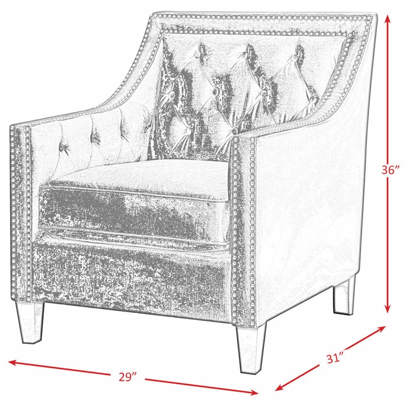 Accentuate your stylish living room design with the Teagan chair. This accent seat is upholstered in smooth velvet-like material and features attractive diamond tufting and decorative nailhead trim. Its clean lines and refined silhouette blend seamlessly with your transitional or contemporary space.