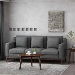 GDFStudio Noxon Fabric 3 Seater Sofa With Accent Pillows, Charcoal + Dark Walnut
