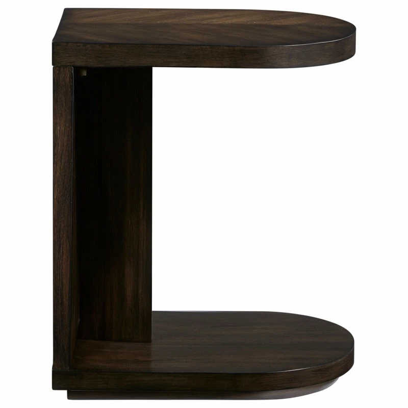 A chairside C-table that is a sophisticated approach to your “modular” needs. This table silhouette is shaped beautifully to look as if you are not just adding it to your upholstery but more like it becoming part of it. The gorgeous “Sepia” finish dresses the group in a deep rich sensuous brown, almost black color. Looks like a million bucks. Open bottom storage. Open bottom storage.