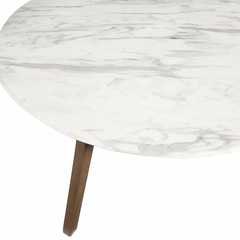 Taking durable to a different level is what these tables are all about. Table tops made from moulded High Pressured Laminate hardboard can take on spills, burns, even hammers. Yes I said hammers and if your household is like most, that doesn’t sound so strange. This round “Pixie” end table is perfect for sectionals or any modern transitional style that calls for clean sophistication. The table top looks and feels like natural white Carrara marble that has a textured feel. Base, including the great splayed modern legs in an easy honey finish perfect for all. Lightweight for easy mobility and compliments perfectly.Domini White table top looks like natural white Carrara marble