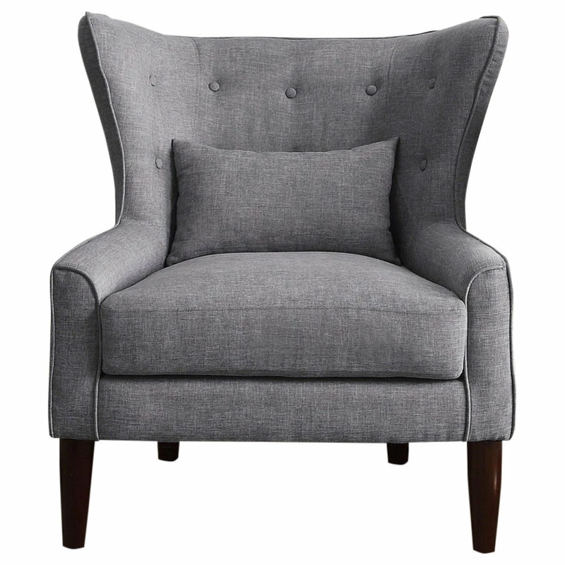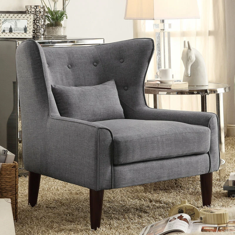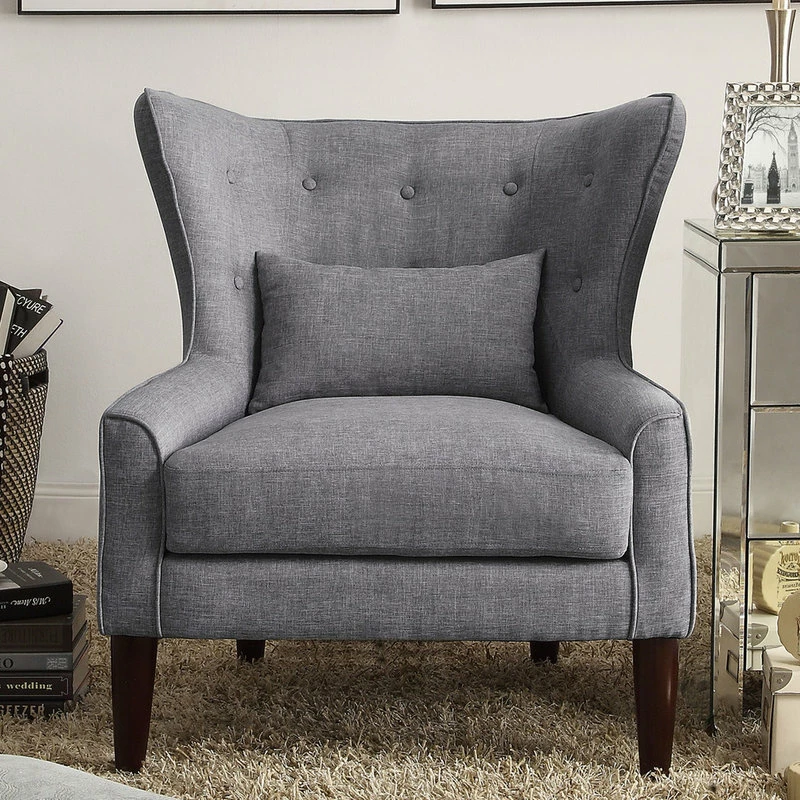 Modernize your space with the Millet Wingback Chair. This beauty features a curved con-caving backrest, individually wrapped tufted button detailing, a wide foam cushioned seat, and cylindrical espresso finished tapered legs. Throw pillow provided to accentuate this contemporary sleek and stylish accent chair. Available in colors beige, brown, gray, navy, pink, charcoal, green, violet, and burgundy. Handcrafted with a sturdy solid wood, this chair is extra cushioned with foam for comfort, stability, and durability. Transform your living room, bedroom, or office with this richly designed accent chair. Pair these in your living room for a perfect evening chat with your family and friends. Made with non- toxic materials, this Millett Wingback chair is also fire resistant and animal-friendly. The Millet Wingback Chair is the chair you have been looking for.