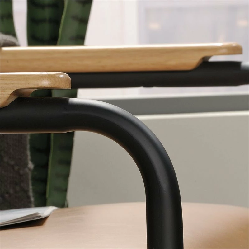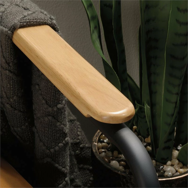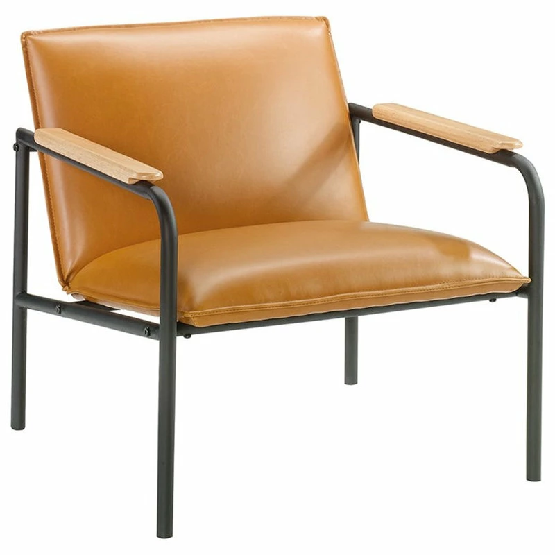 Add sophisticated style and comfort to your home décor with this chair from the Boulevard Café collection. This handsome lounge chair features a leather-like cushioned seat and back for comfort you can enjoy while you sit back and scroll on your smartphone or relax while watching the evening news. Its two armrests are accented with wood arm caps for an extra touch of elegant style that is sure to catch the eye of all your guests. Attractive from every angle, this mid-century inspired accent chair is the perfect accent no matter where it stands – living room, dining room or office! With its unique Camel color and durable, powder coated black metal frame, this classy chair gives your home décor the wow factor that you have been looking for. This item is for residential use only.