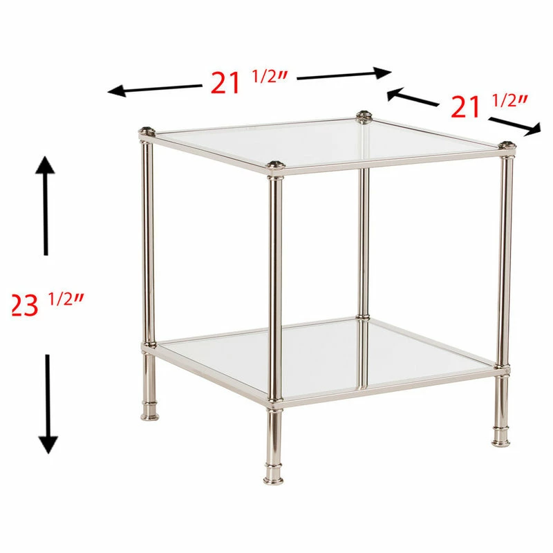 Add a little bit of shimmer in your life with this metallic silver end table. Reflective mirrored shelf has you seeing double and spacious glass tabletop has more than enough room for a chic table tamp and your current reads. Measure out a taste of the glamorous life with the tailored look of this end table in a reading nook, formal living room, or bath.