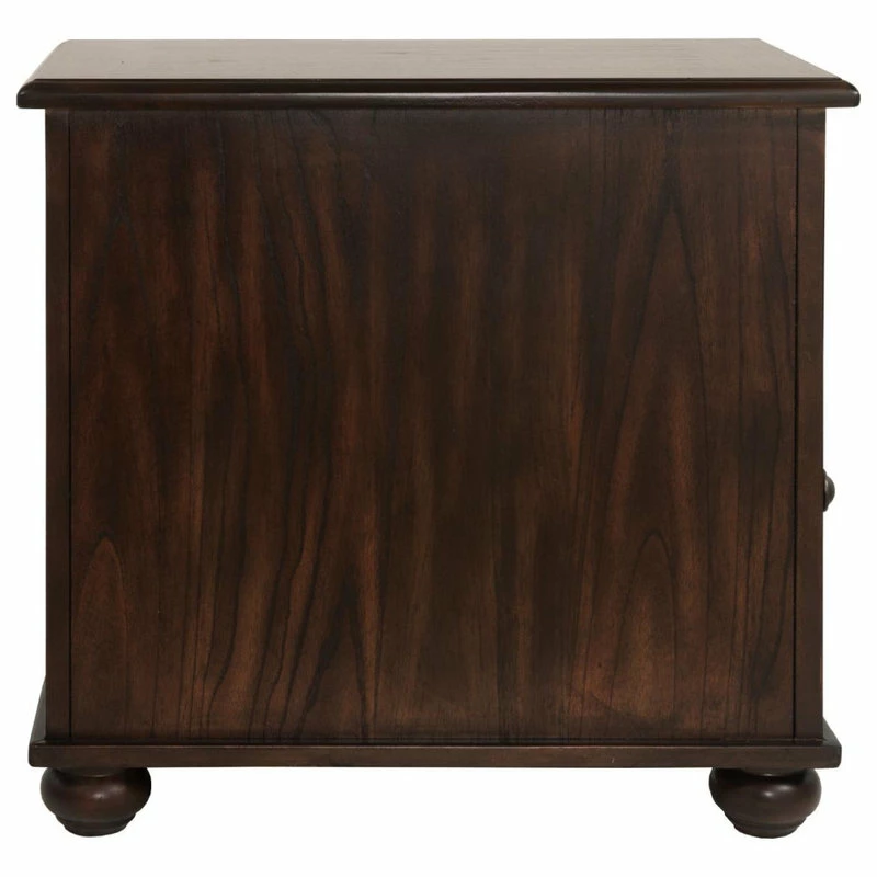 Everything’s within reach with the compact Barilanni chairside end table. You won’t have to leave a seat to charge electronic devices since this stylish companion has two handy built-in USB charging ports, two AC outlets, an open storage cubby and a lower cabinet�perfect for tucking away all your chairside necessities. Its attractive design with smooth dark brown finish is accented with bronze-tone hardware and bun feet for a casual look.