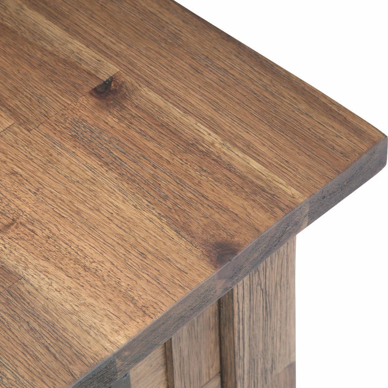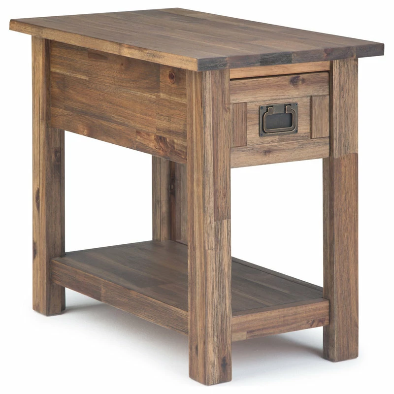 Pair your sofa, accent chair or bed with the rustic contemporary Monroe Narrow Side Table. It features a single drawer and open bottom, perfect for storing and displaying treasured mementos. This striking table is made from beautiful and distinct Acacia solid wood. With its clean lines, shaker style paneling and Antique Brass pulls, the Monroe Narrow Side Table will enhance your room decor. The Monroe collection includes a matching coffee table.