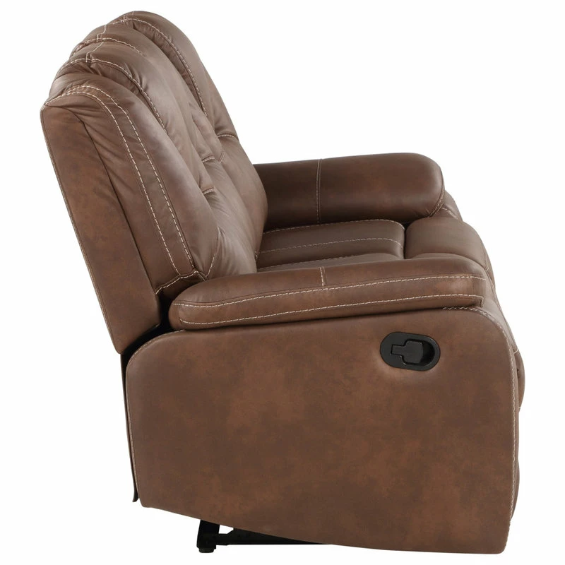 The Katrine Reclining Sofa showcases the best in manual motion upholstery with this dual reclining ensemble. This Sofa is covered in a luxurious faux-leather that features baseball stitching for an extra special touch and comes with padded armrests and a raised, padded headrest to ensure a comfortable view and seat even when fully reclined. Available in Chestnut Brown or Charcoal.