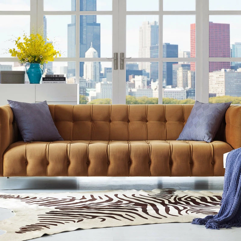 Our Bea sofa is a true a beauty. This rich velvet upholstered sofa is designed with a deep seat, luxe tufting and Lucite legs. Bea adds style and color to any room.