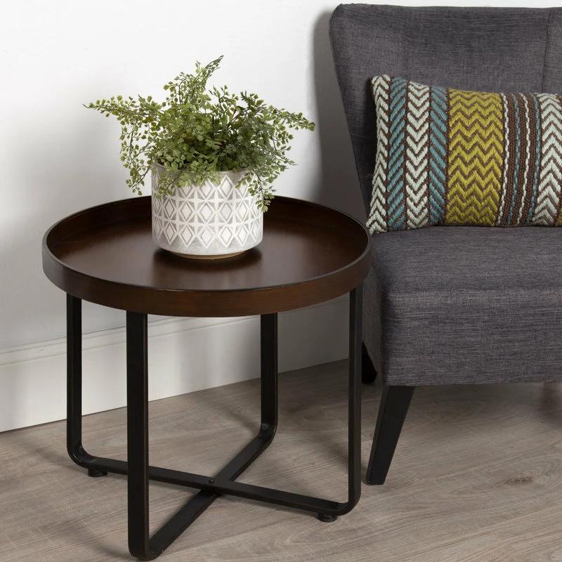 - Round tray end table for use next to a chair or sofa in the living room or as a nightstand.