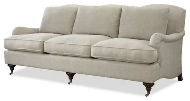 The Churchill Sofa blends traditional comfort and details like a rolling camelback and pleated English arms, all upholstered in 100% Belgian linen, with the convenience of castered front legs, making moving this spacious three-cushion beauty much easier.
