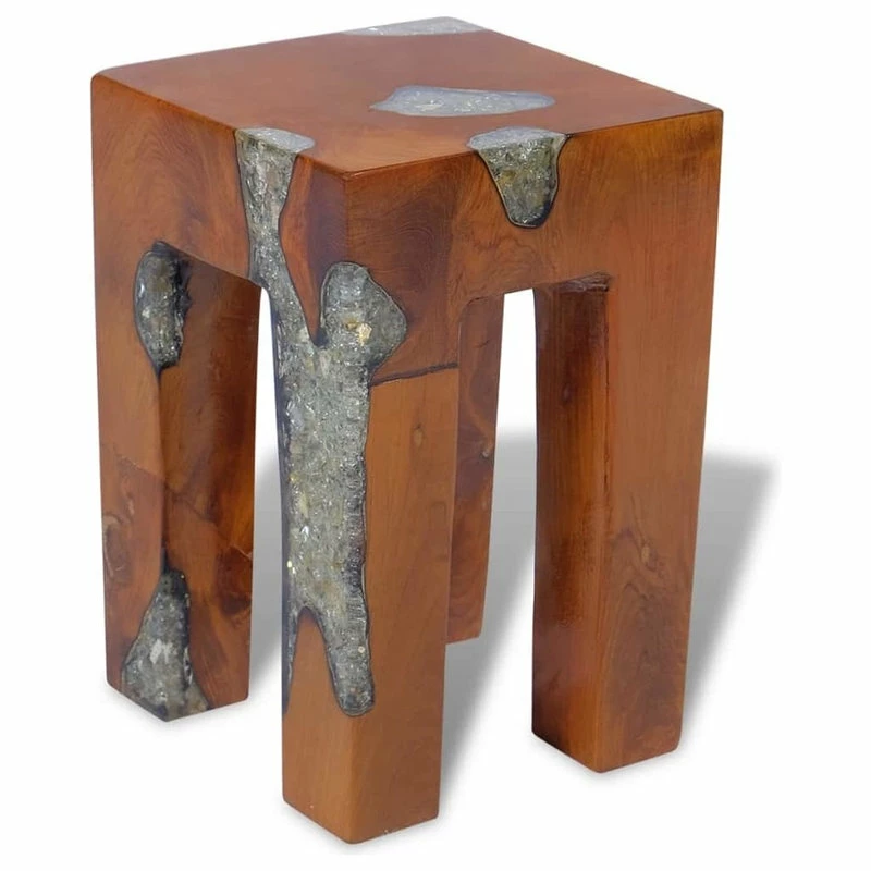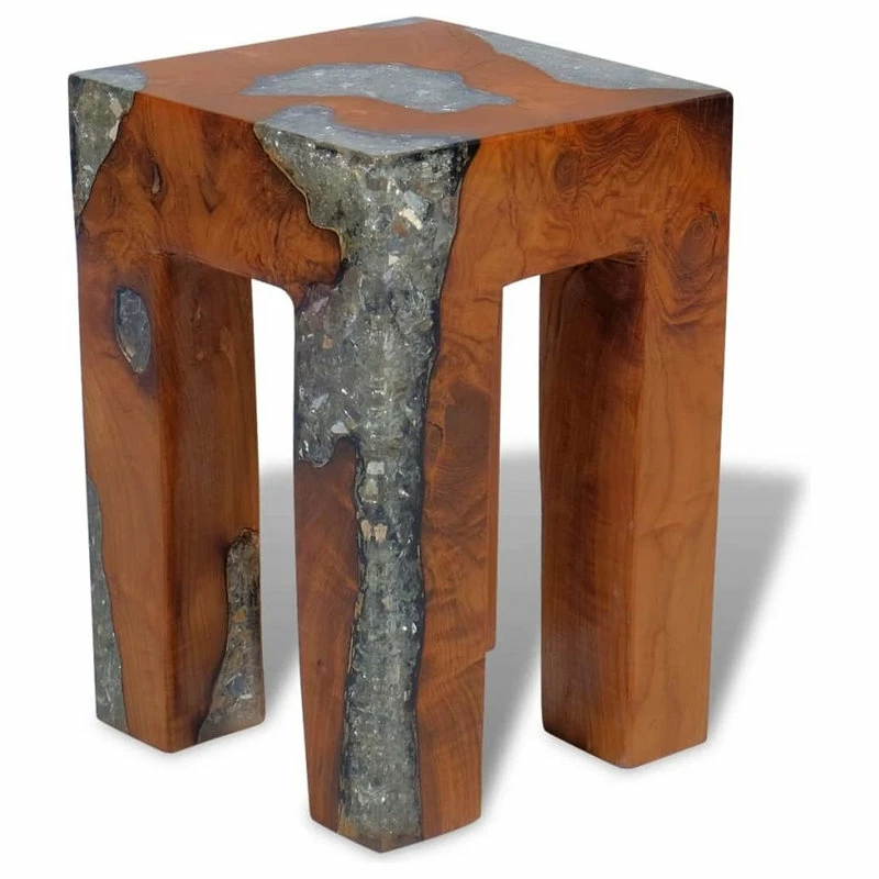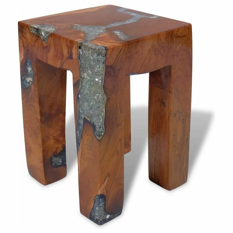 This unique wooden stool, made of solid teak with a transparent resin decoration, exudes a rustic charm and is a real eye-catcher. The stool can also be used as a footrest, side table, etc. The stool is fully handmade and the craftsmanship adds to its luxurious appearance. It also features four stable legs. Important note: As wood is a natural product, the colors and grain patterns vary from piece to piece, making each of our stools unique and different from the next; the delivery is random.