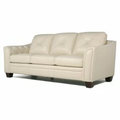 This fully upholstered modern sofa, which is white or grey L-grade leather, features two oversized cushions. In total, there are six cushions on this couch, two seat cushions, two back cushions and two arm cushions. All six cushions feature a self-welt detail. All of these fluffy cushions sit atop a tight, upholstered frame, chrome bracket style legs and tuxedo arm.