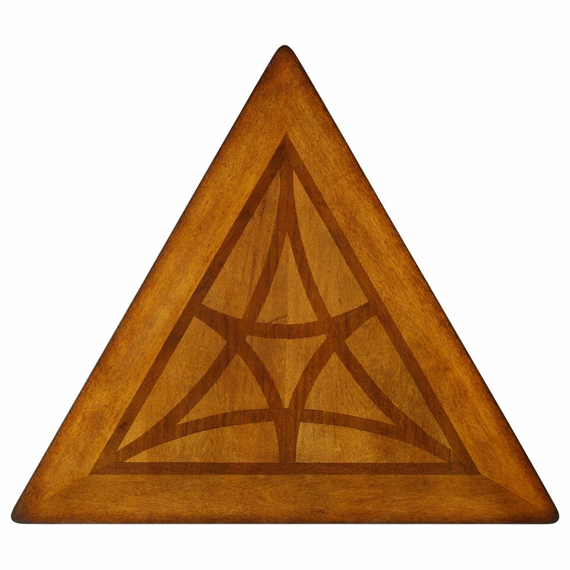 Walnut finish triangle accent table features a decorative symmetrical design on top.With two shelves for ample storage beneath. Wipe with a dry cloth. Made in China.